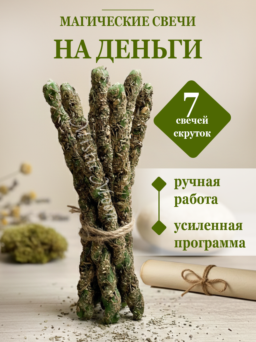 Набор состоит из 7 свечей скруток зеленого цвета, изготовленных из натурального 100% пчелиного воска с травами ручного сбора по авторскому рецепту. Ритуальные свечи скручиваются вручную и выкатываются в смеси трав, усиливающих магическое действие свечи. В наборе идет заговор и инструкция к обряду, Подходит для профессиональных ритуалов и обрядов, магии и колдовства, медитаций и гадания.