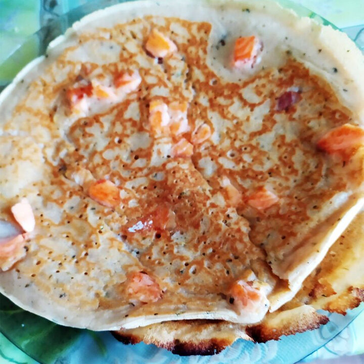 ✔ Сыворотка молочная — 250 мл; ✔ Мука гречневая —≈3 ст.л. с горкой; ✔ Мука цельнозерновая (пшеничная или полбяная) —≈3 ст. л. с горкой; ✔ Яйцо — 1 шт.; ✔ Соль —щепотка; ✔ Сода —на кончике ножа, для разрыхления; ✔ Масло растительное в тесто —2 ч. л.. ✔ Рыба красная слабосолёная — 100 г (филе). ✔ Масло растительное для смазывания сковороды —≈1 ч. л., на всю партию. После приготовления домашнего творога осталась молочная сыворотка — её можно просто пить или использовать для окрошки, но я решила испечь блины. Учитывая, что блины из гречневой и цельнозерновой муки получаются менее эластичными, чем пшеничные, я сделала их чуть толще. Изначально я планировала промазать блины паштетом из куриной печени и собрать этакий блинный тортик. Но в морозилке нашёлся кусочек солёной красной рыбы, припрятанный «на всякий случай». Этот случай настал! Рыбу я измельчила и использовала двумя способами: 1. Просто посыпала кусочками рыбы блины прямо на сковороде, пока тесто ещё не схватилось. 2. Вмешала часть
