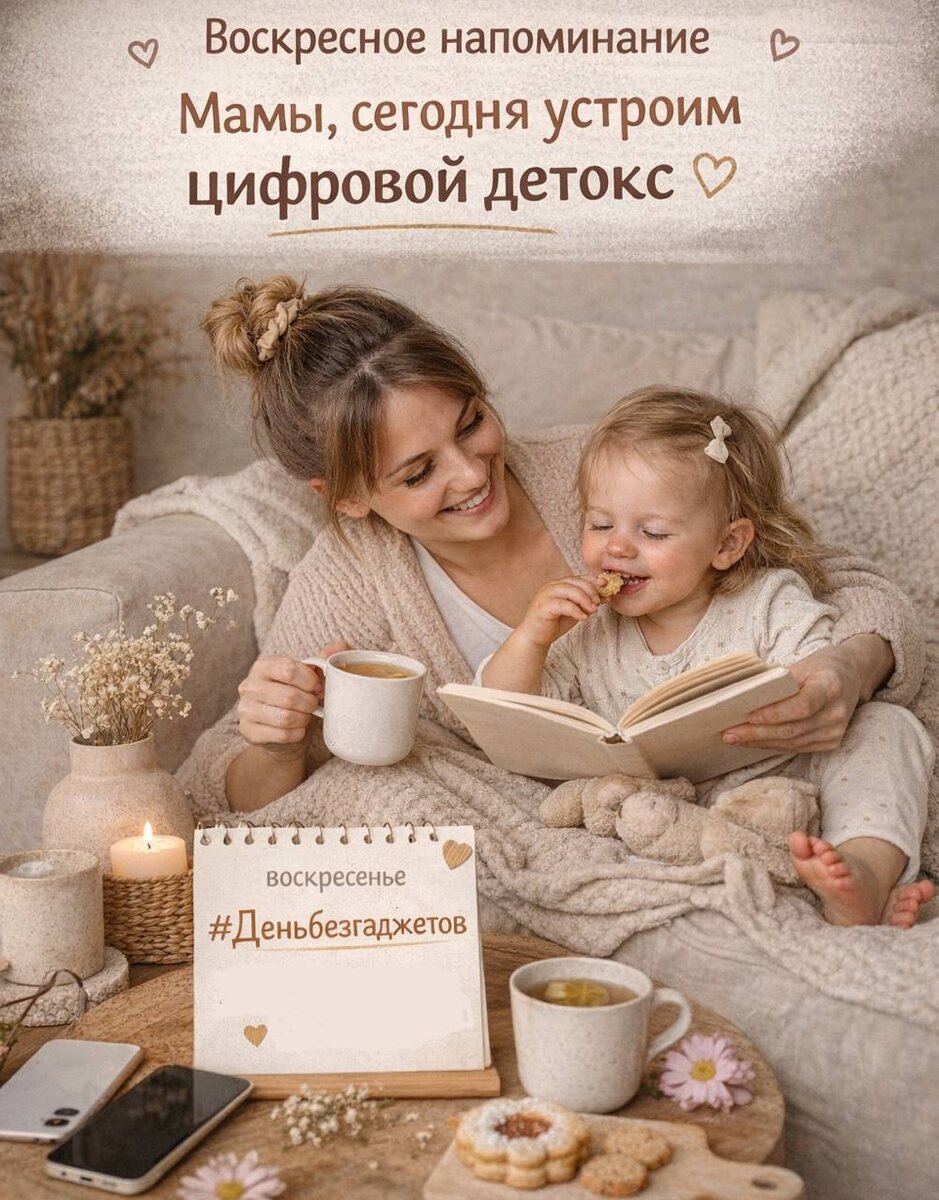 Мамы, давайте повторим своё маленькое (или большое!) чудо: отключим телефоны и гаджеты на 1 час или даже на целые 24 часа. Почему это важно? 🎀 Наши дети учатся через пример – если мы умеем отдыхать, они тоже учатся заботе о себе. 🎀 1 час без экрана — это час настоящего внимания себе или семье. 🎀 Полный день без гаджетов — это глубокое восстановление для всех, новые эмоции и воспоминания, которые останутся на всю жизнь. Совет для мам: начните с 1 часа «цифрового детокса» прямо сегодня. Почитайте книгу, примите ванну, посмотрите на мир без экрана. Даже маленькая пауза работает. ✨ Сделайте этот день вашим маленьким праздником заботы о себе и семье. Вы заслуживаете его!