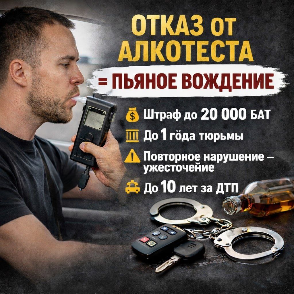 Думали, можно просто отказаться от проверки и поехать дальше? Больше нет. Полиция Таиланда официально приравняла отказ от прохождения алкотеста к управлению автомобилем в нетрезвом виде. Лазейку закрыли: сам факт отказа теперь считается нарушением. Что это значит на практике: • штраф от 5 000 до 20 000 бат • возможное лишение свободы до 1 года • при повторных нарушениях наказание ужесточается • при ДТП с тяжёлыми последствиями срок может достигать 10 лет Правило действует по всей стране. Цель - сократить число аварий, связанных с алкоголем.