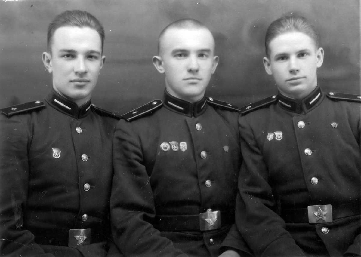 Группа рядовых войск связи в парадно-выходных мундирах со съемными повседневными погонами образца 1943 года.