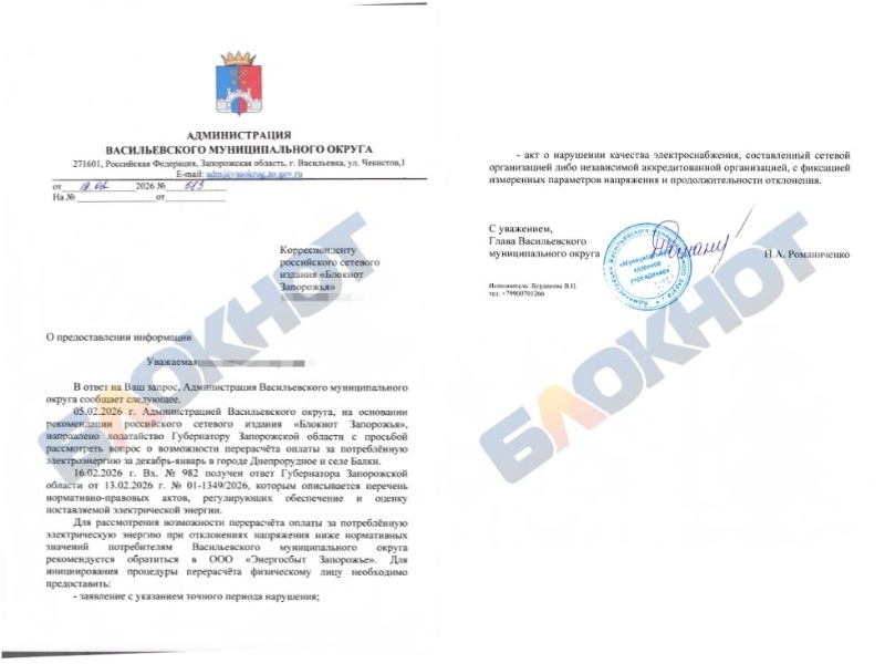 После обращения к Балицкому чиновница раскрыла способ перерасчета платы за электроэнергию. В редакцию «Блокнот Запорожье» поступил ответ от главы Васильевского округа Натальи Романиченко, к которой наши журналисты обращались после массовых жалоб жителей Днепрорудного, Балок и соседних сел, где декабрь-январь выдались тяжелыми из-за проблем с электричеством после ударов ВСУ по энергообъектам. В чат-бот «Блокнота Запорожье» пришло множество сообщений от читателей, которые жаловались на огромные суммы в платёжках за свет, хотя по факту электричество они получали мягко говоря не в должном объёме. Прямо в комментариях под одним из наших постов развернулась дискуссия, и глава округа предложила решение. «Давайте попробуем поднять эти вопросы. Зайдите в администрацию и напишите обращение на мое имя по поводу перерасчета. Хорошо если бы были подписи и других жителей. И на основании этого мы подготовим ходатайство на Губернатора», - написала Романиченко. После этого «Блокнот» направил официально