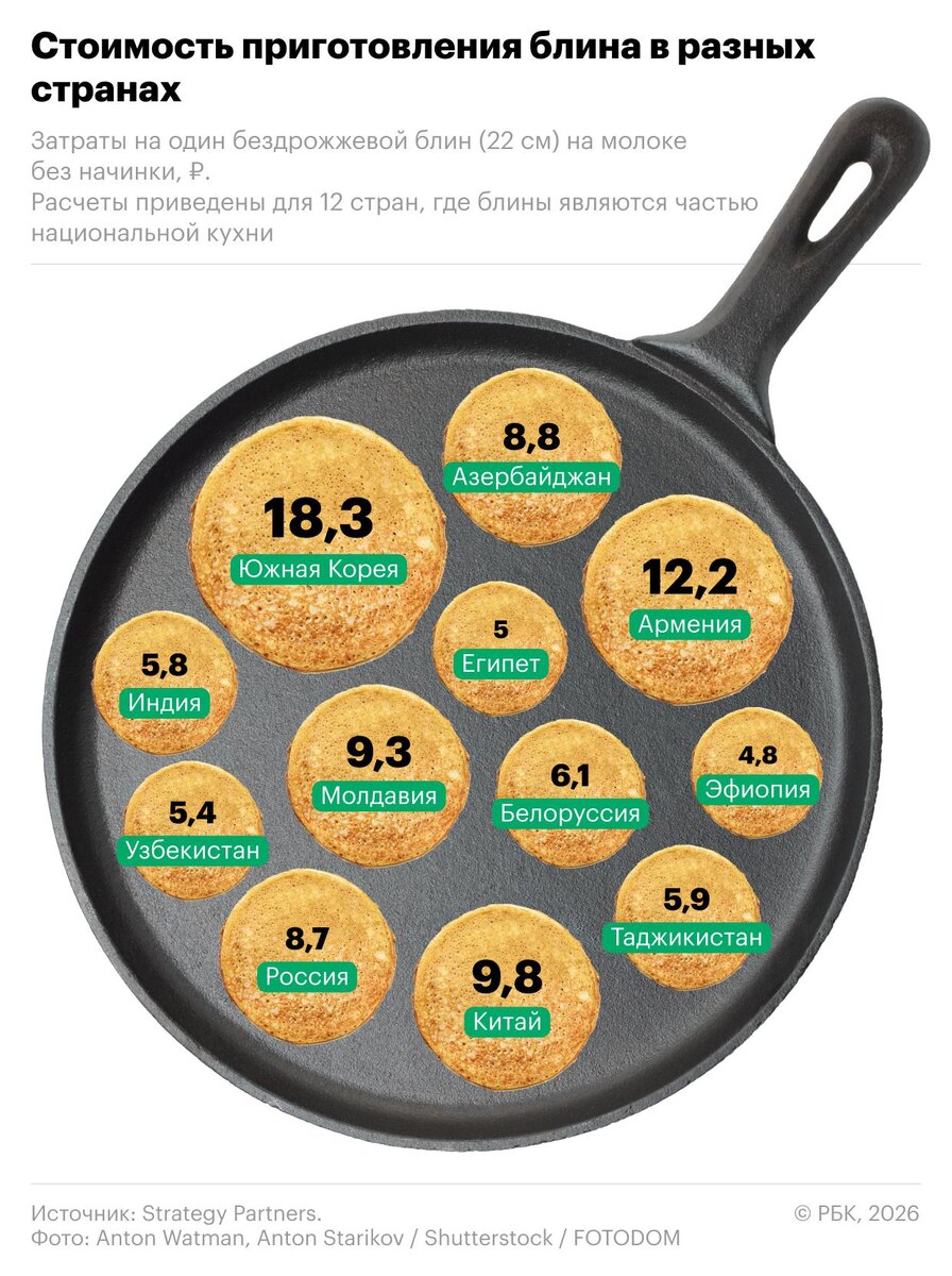 Стоимость приготовления одного блина в России составляет 8,7 руб., что примерно в два раза меньше, чем в Южной Корее, и в два раза больше, чем в Эфиопии. Сколько стоят блины в разных странах — в инфографике РБК Россия занимает шестое из 12 мест по стоимости приготовления одного блина, выяснила консалтинговая компания Strategy Partners. В исследовании учитывалась дюжина государств, в которых блины являются частью национальной кухни. Хотя во всех этих странах блины отличаются рецептурой, формой и составом, для расчета использовались цены в стране на ингредиенты для традиционного русского рецепта приготовления бездрожжевых блинов: Предполагалось, что из общего объема продуктов получается 15 блинов диаметром 22 см. Читайте также: FT сообщила об угрозе кредиту Киеву от МВФ на $8 млрд из-за вето Венгрии