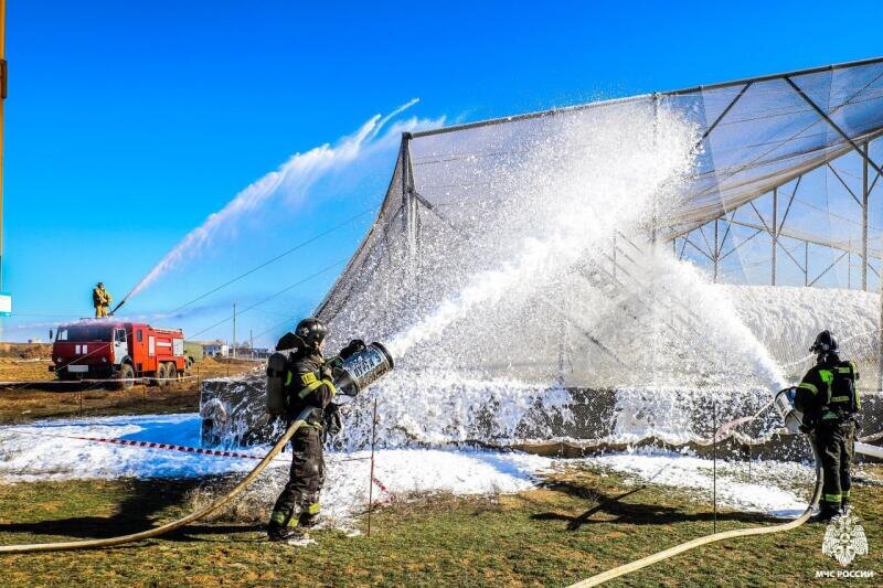 Астраханские спасатели провели пожарно-тактические учения на объекте топливного парка. Главная задача тренировки — отработка действий при тушении горящих резервуаров с топливом. Согласно легенде учений, в трех наземных резервуарах произошло возгорание авиационного топлива. Огонь стремительно распространился на площади 400 м², создав реальную угрозу для соседних объектов. Прибывшие в кратчайшие сроки подразделения немедленно приступили к боевому развертыванию. Первоочередными задачами стали охлаждение 16 соседних емкостей и подготовка к решающей фазе — пенной атаке. Чтобы сбить интенсивное пламя, пожарные одновременно подали воду с лафетных стволов и провели массированную атаку пеной. Слаженная работа расчетов позволила ликвидировать условный пожар в кратчайшие сроки, не допустив его распространения. Всего в учениях было задействовано 10 единиц спецтехники и 35 человек личного состава.