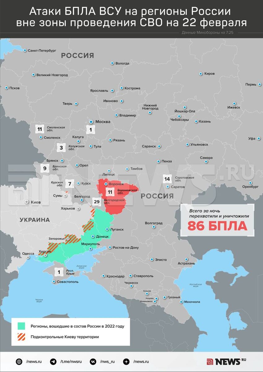 86 украинских БПЛА сбили силы ПВО за ночь над регионами России, сообщает Минобороны.