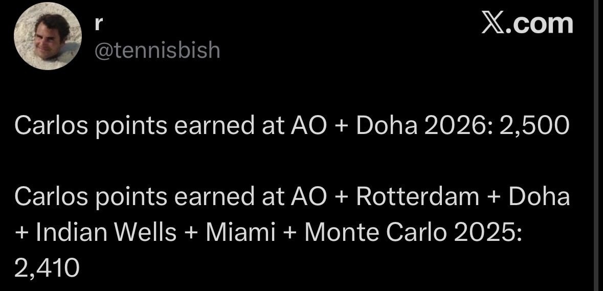 Карлос Алькарас в 2024 заработал больше очков, чем за все турниры в начале 2025 😂