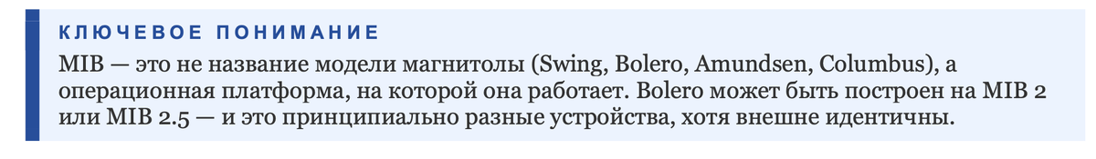 MIB расшифровывается как Modular Infotainment Baukasten — «модульный информационно-развлекательный конструктор». Это операционная платформа, которую Volkswagen Group разработала совместно с Harman International для унификации мультимедийных систем по всему модельному ряду.