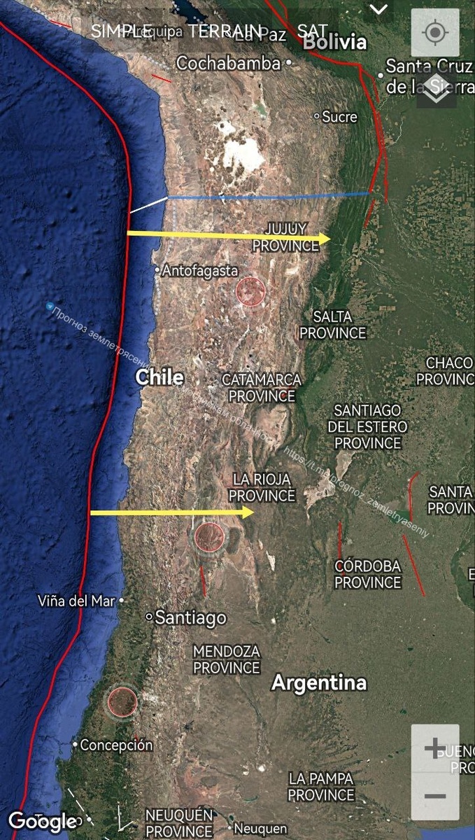In the north of Chile/Argentina, the magnitude of a possible event may reach M7.3+/-0.2