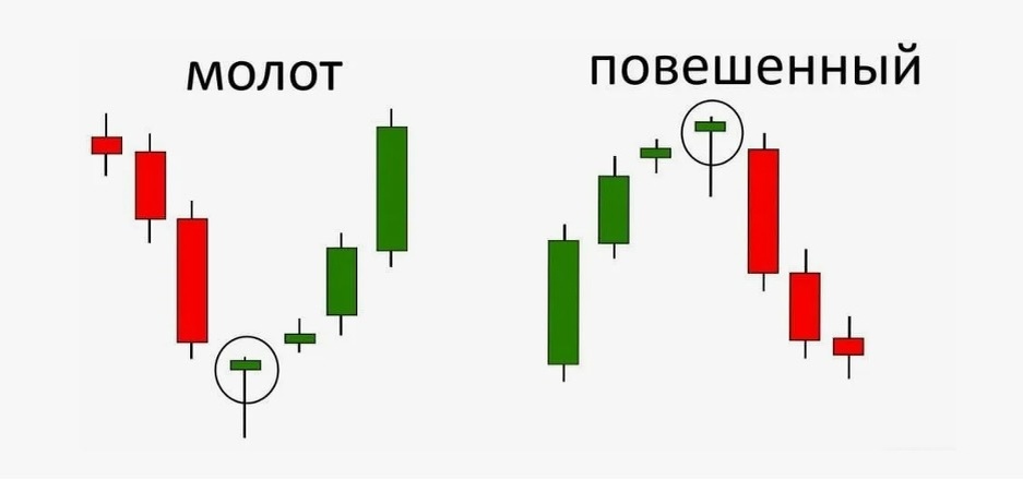 1. Молот и Повешенный — это свечи с маленьким телом и очень длинной нижней тенью.