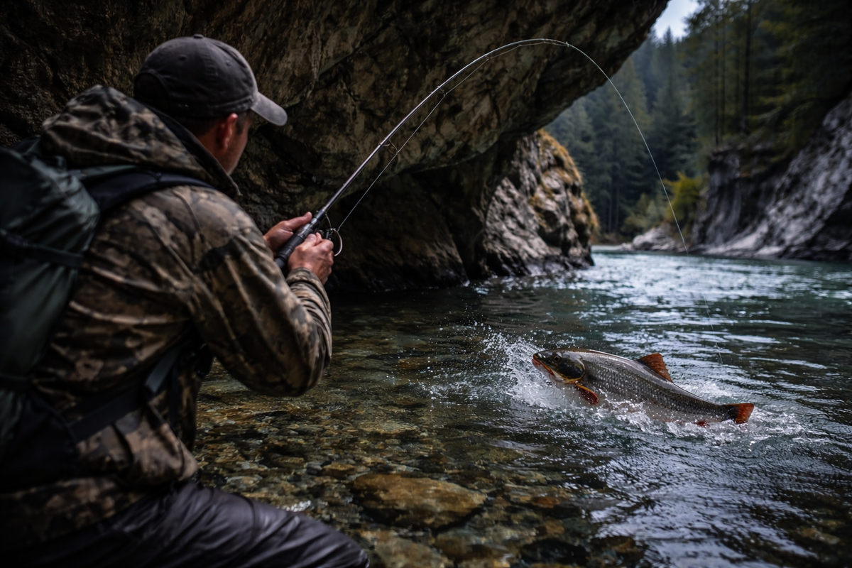 Горная река не прощает спешки. Она не шумит — она говорит. И если не слушать, можно уйти без рыбы, но с уроком, который останется надолго. Мы шли к той яме почти два часа. Тропа вилась вдоль скал, иногда исчезала в курумнике, где каждый камень проверяет твой шаг. Река внизу шла прозрачной лентой, холодной, быстрой, с перекатами, где вода белеет, как пена на морозе. Здесь живёт ленок. Осторожный, сильный, умный. Место было особенным — под нависающей скалой, где течение резко замедляется и образует глубокую тёмную чашу. Сверху её почти не видно. Только если встанешь правильно, если солнце попадёт под нужным углом — тогда в прозрачной воде можно различить тень. Мы спустились тихо. Без лишних слов. Рыбалка на ленка — это не разговоры. Это внимание к мелочам. Вода ледяная. Ноги сводит через несколько минут, даже в забродниках. Течение тянет, словно хочет проверить — достоин ли ты стоять здесь. Я сделал первый заброс аккуратно, чуть выше ямы, чтобы приманка прошла вдоль каменной кромки. Ник