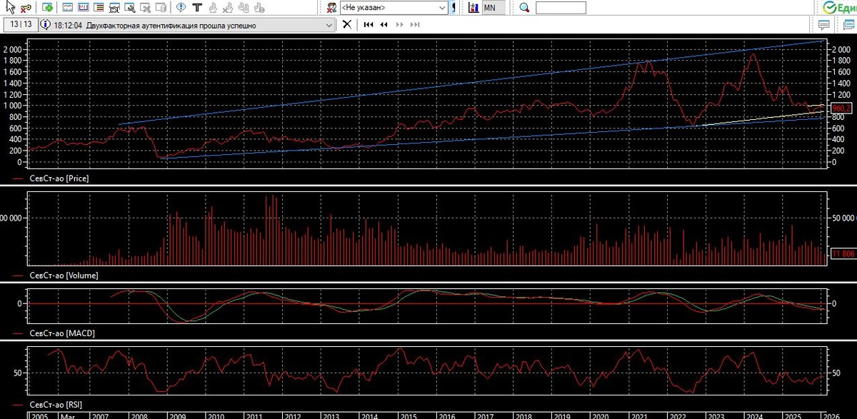 Как видим из прогнозов по дивидендам инвесторы и акционеры, скорее всего не смогут в 2026 году получить дивиденды. Компания практически имеет минимальную прибыль, в основном денежных средств хватает на поддержание производства в рабочем состоянии. Исходя из такой информации, сделаем обзор движения акции Северсталь с помощью технического анализа до конца марта 2026 года.