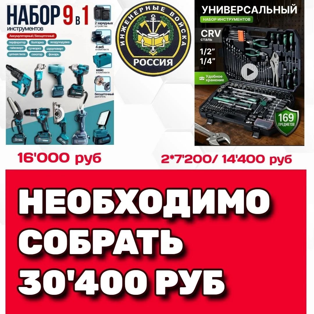 Открываем сбор для инженерно-саперного батальона на: 1. Набор инструментов 9 в 1 - 16'000 руб. 2. Универсальный набор инструментов - 2 шт. - 14'400 руб. 🚩Сумма к сбору - 30'400 руб. 🔺Собрано - 3'013 руб. 🔺Осталось собрать - 27'387 руб. Поддержите, пожалуйста, сбор. Инженерно-саперный батальон выполняет не только задачи по минированию и разминированию, но и многие другие (разведка, строительство блиндажей, пантонная переправа и др.). Любую посильную сумму можно перевести на номер карты 💳2202208188194204 или по номеру телефона 📞+79530562233 Получатель - Светлана Владимировна Л. ("Сбербанк") ❤️Спасибо большое вам за поддержку! #уралсвоихнебросает #помощьраненым #медицинскаяпомощь #вместемысправимся