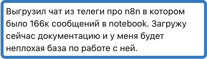 Выгружаете всю историю чата к себе, дальше аккуратно добавляете в notebooklm и получаете бесконечный источник вдохновения по заданной теме... И это будет то, что именно люди советуют, а не общие мысли нейронки, которые она нашла в Инете. А профильных чатов в Телеграмме дофига - найти не сложно. Русский ИТ бизнес