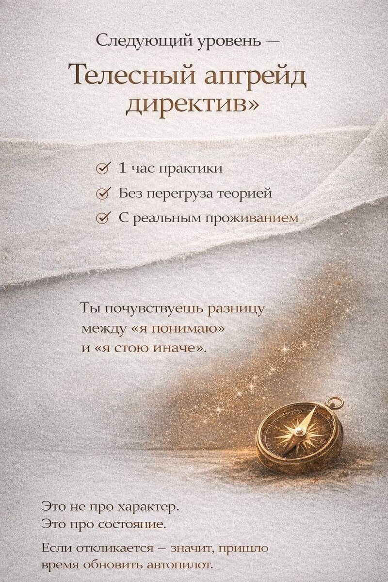 Следующий уровень — Телесный апгрейд директив. 1 час практики. Без перегруза теорией. С реальным проживанием. Ты почувствуешь разницу между «я понимаю» и «я стою иначе». Это не про характер. Это про состояние. Если откликается — значит, пришло время обновить автопилот. Приходи сегодня в 16:00