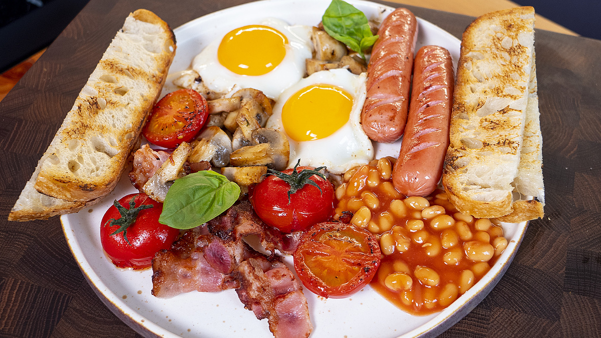 На сковороде обжарить бекон до хруста → выложить на тарелку. В жир от бекона: шампиньоны (на 4 части) + томаты (срезом вниз) → обжарить. На сосисках сделать надрезы → обжарить до корочки. Всё готовое (бекон + грибы + томаты + сосиски) выложить на тарелку, добавить фасоль в соусе. На двух сковородах растопить масло: На одной — глазунья на минимальном огне (желток должен остаться жидким, но белок схватиться). На второй — хлеб обжарить с двух сторон до золотистой корочки. Собрать на тарелке: овощи/фасоль/мясо → сверху яйца и тосты. Готово! Подавай горячим с кетчупом или соусом по вкусу. Настоящий британский завтрак для тех, кто любит плотно поесть.