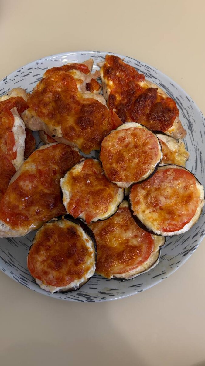 Ингредиенты: Филе бедра индейки Творожный сыр Помидоры Сыр Баклажан Приготовление: Нарезаем индейку, отбиваем с 2 сторон, солим, перчим. Выкладываем на противень. Рядом или на отдельный противень выкладываем баклажаны, тоже солим их. Сверху и мясо и баклажаны смазываем творожным сыром, мледующим слоем выкладываем нарезанные помидоры и посыпаем все тертым сыром. Запекаем при 200° 15-20 минут. #ужин #баклажаны