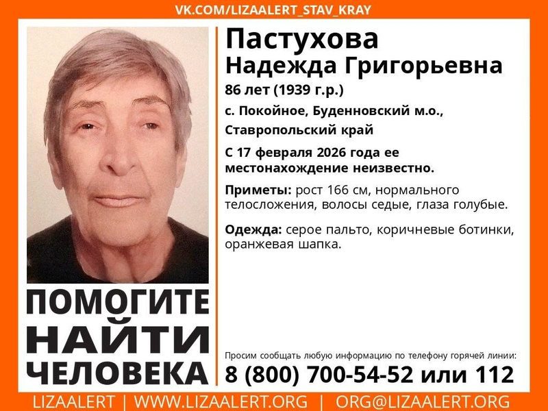 В селе Покойном Будённовского округа пропала 86-летняя пенсионерка Надежда Григорьевна Пастухова. О женщине нет вестей с 17 февраля. Приметы: рост — 166 см, нормальное телосложение, голубые глаза и седые волосы. Пенсионерка была одета в серое пальто, коричневые ботинки и оранжевую шапку. Всех, кто располагает какой-либо информацией о местонахождении пропавшей, просят сообщить по номеру: 8(800)700-54-52. Ранее сообщалось, что волонтёры ищут пропавшего в Ставрополе мужчину с собакой — стаффордширский терьер коричневого окраса.