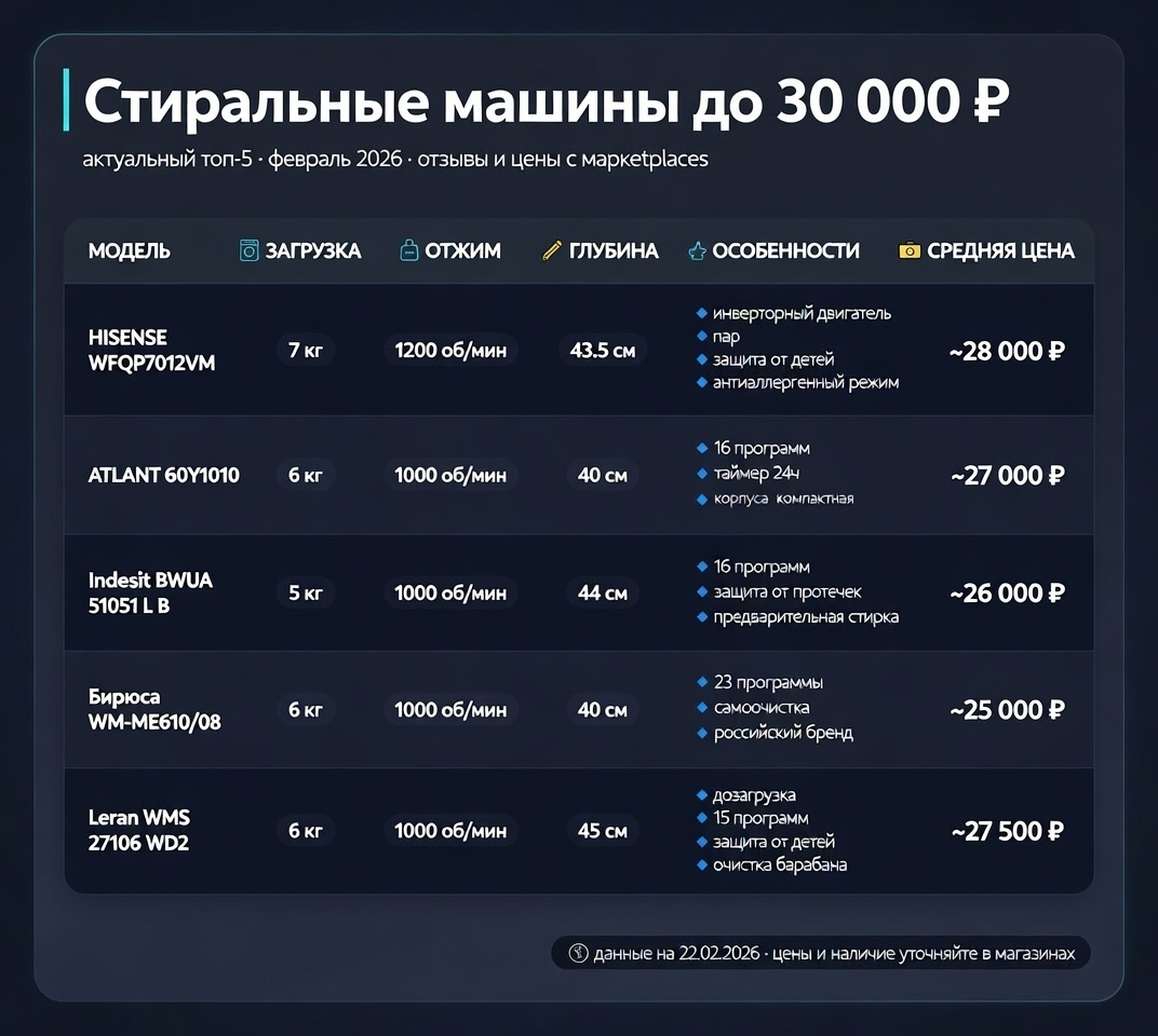 Выбрать хорошую стиральную машину с бюджетом до 30 000 рублей — задача вполне выполнимая. В 2026 году даже в эконом-сегменте производители предлагают модели с инверторными моторами, паровой обработкой, защитой от протечек и вместительным барабаном до 7 кг. Конечно, здесь не будет сушки и сложных AI-алгоритмов, но базовые задачи такие машинки решают на отлично.