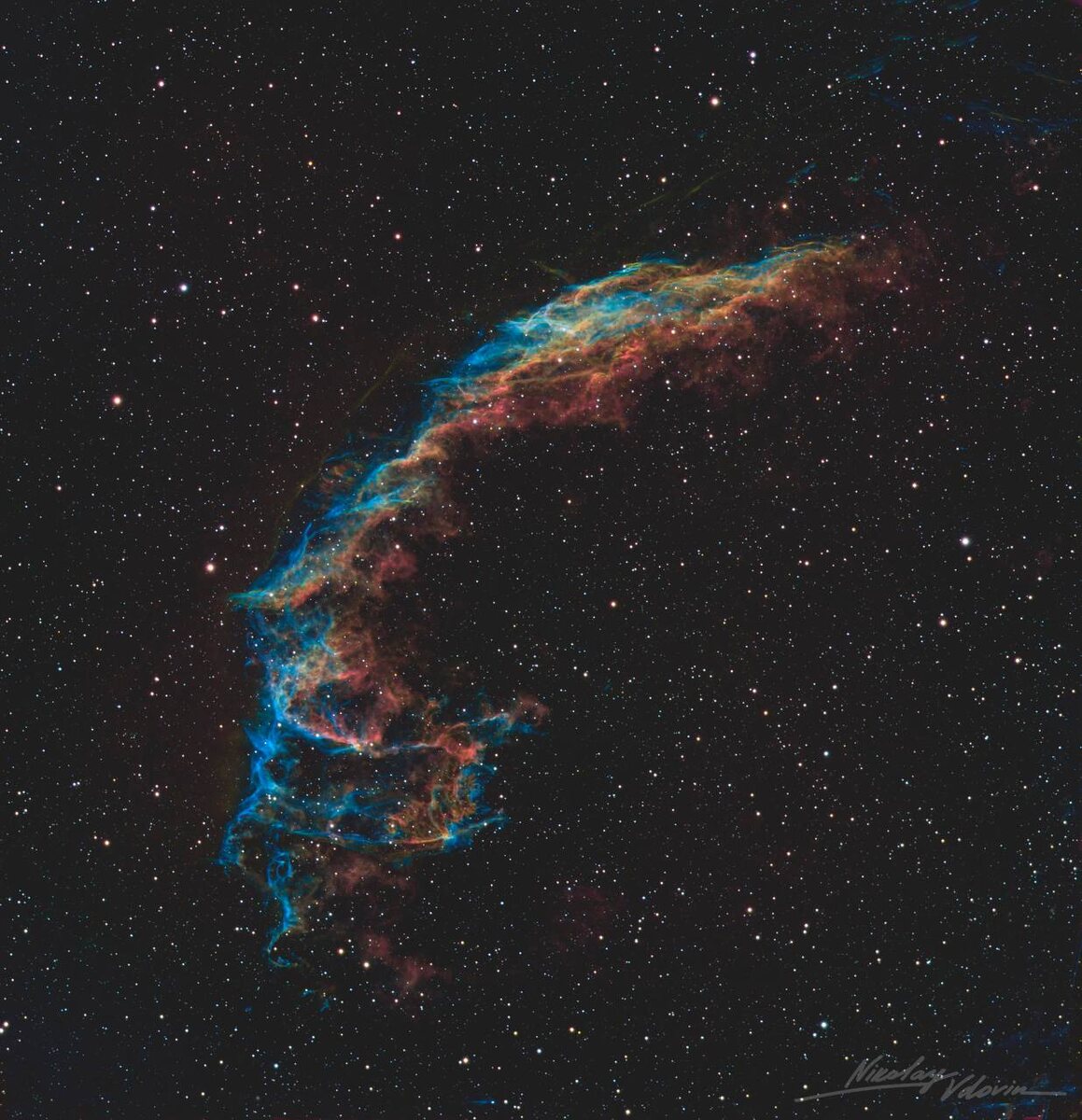 » 💌 Так западную часть туманности Вуаль назвал Роскосмос. 10–20 тысяч лет назад массивная звезда взорвалась как сверхновая. Ударная волна разогнала окружающий межзвёздный газ, сформировав гигантскую светящуюся структуру диаметром около 100 световых лет. Её газ разогрет ударной волной до десятков тысяч градусов, что объясняет такое яркое свечение. Выдержка этого фото составила 8 часов 46 минут #КрасивыйФакт ➡️ НОС: Телеграм | ВКонтакте | МАХ