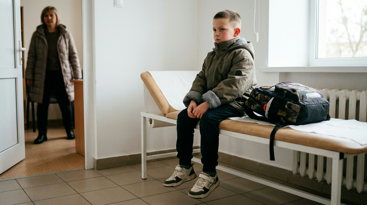 Матвей сидел в медицинском кабинете на кушетке. Ноги в кроссовках не по размеру не доставали до пола. Куртка – на два размера больше, рукава подвёрнуты валиками в три слоя, застёжка до подбородка. Взрослая, не детская. Стриженый, с красными ушами и выражением лица, которое означало одновременно «хочу плакать» и «категорически не собираюсь».
