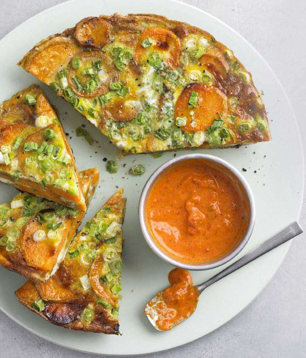 Время приготовления — 25 минут. 4 порции. Ингредиенты: 1. Нарежьте картофель кругами толщиной примерно половина сантиметра. Нагрейте 2 столовые ложки оливкового масла в сковороде с антипригарным покрытием, которую можно ставить в духовку, диаметром примерно 25 см, положите в неё картофель и приправьте. Накройте и готовьте примерно 10 минут до размягчения, постоянно помешивая. 2. Тем временем положите перцы в блендер, добавьте уксус, 1 столовую ложку оливкового масла, паприку, кумин, чеснок, немного приправьте и взбейте, чтобы получился однородный соус. 3. Нагрейте гриль до высокой температуры. Положите лук на картофель, залейте сверху яйцами и покачайте сковороду для равномерного распределения. Поставьте сковороду под гриль примерно на 8 минут, постоянно потряхивая сковороду до тех пор, пока яйца полностью не приготовятся. Подавайте с соусом из перцев. В одной порции: 409 килокалорий, 15.3 грамма белка, 46 граммов углеводов, 19.5 грамма жира, 4.2 грамма насыщенных жиров, 6.9 грамма кле