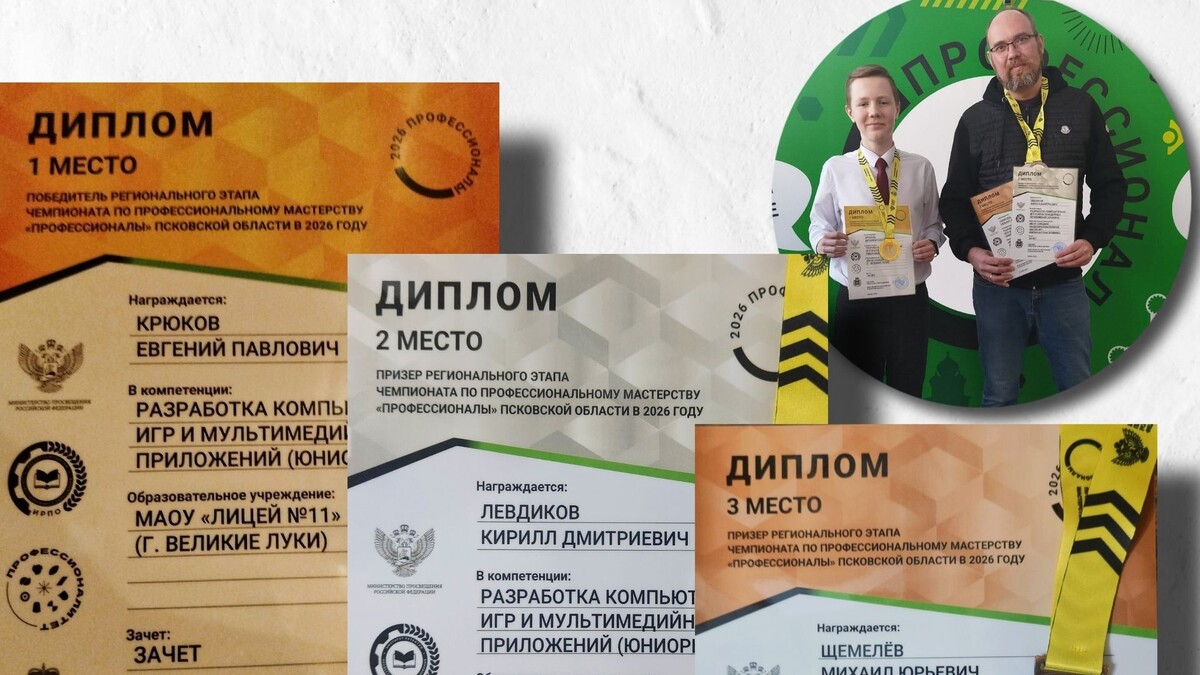 » 🏆 Участники из Великих Лук заняли весь пьедестал в компетенции «Разработка компьютерных игр и мультимедийных приложений» на региональном этапе чемпионата «Профессионалы». 🎯 Первое место занял Евгений Крюков, второе — Кирилл Левдиков, третье — Михаил Щемелёв. Все они подготовлены Центром «IT-куб.Великие Луки». 📅 Церемония закрытия прошла 20 февраля в Псковском областном колледже искусств. Победители будут участвовать во всероссийском этапе. 👉ВЛуки.ру