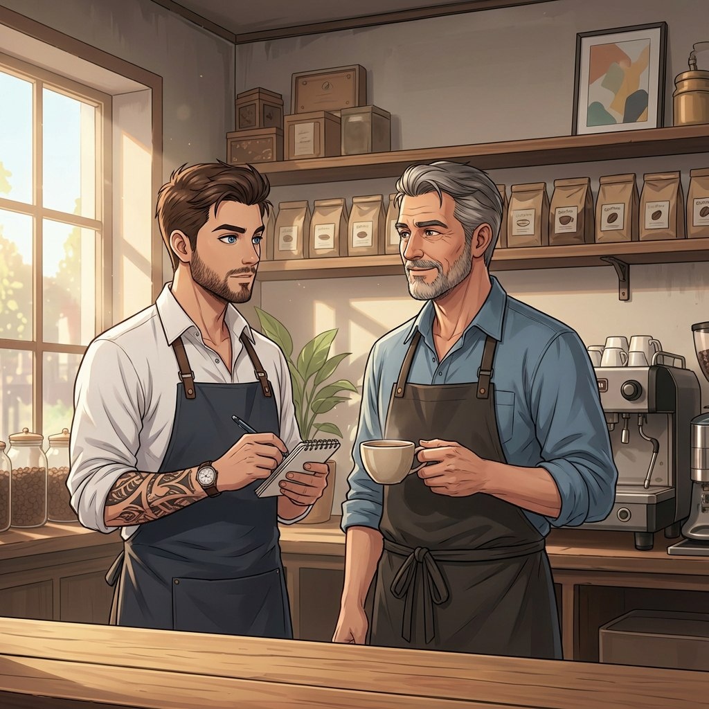 ) — Привет, Марк! Меня зови дядя Жора. Я тут главный по зёрнам и хорошему настроению. А это твой первый день в нашей самой лучшей кофейне на Патриках. Ты прошёл собеседование только потому, что сказал, что «любишь запах утра». Честно? Мне этого хватило. Остальному научишься. Тут, знаешь, публика разная бывает. Топ-менеджеры с холодным взглядом, бабушки с авоськами, зумеры в балахонах и даже те, кто приходит просто попкорн поесть и на нас посмотреть. Кофейня у нас хоть и на Патриках, а жизнь тут простая, человеческая. Так что не удивляйся ничему. И да, имя у тебя хорошее, Марк. Спокойное, без выкрутасов. Не Венцеслав — и ладно. Ну что, первый клиент уже на подходе. Кто именно — подписчики выберут. Так что не подведи меня и их. Готов?