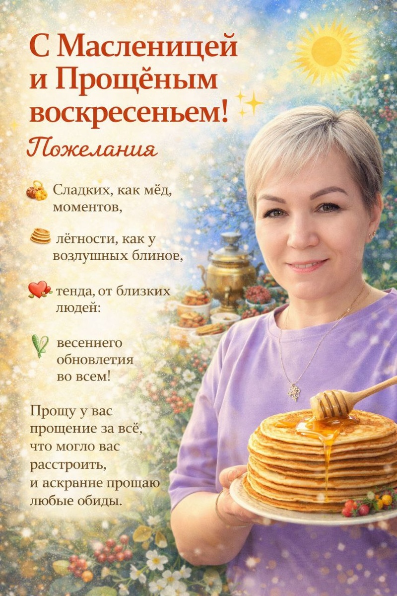 : сладких, как мёд, моментов; 🍯 лёгкости, как у воздушных блинов; 🥞 тепла от близких людей; 🤗 весеннего обновления во всём! 🌸 Прошу у вас прощения за всё, что могло вас расстроить, и искренне прощаю любые обиды. Давайте встретим весну с лёгкостью на душе! 🌞 С любовью и теплом Нина Васильева 💞 Фото создано в официальном чате GPT бесплатно.