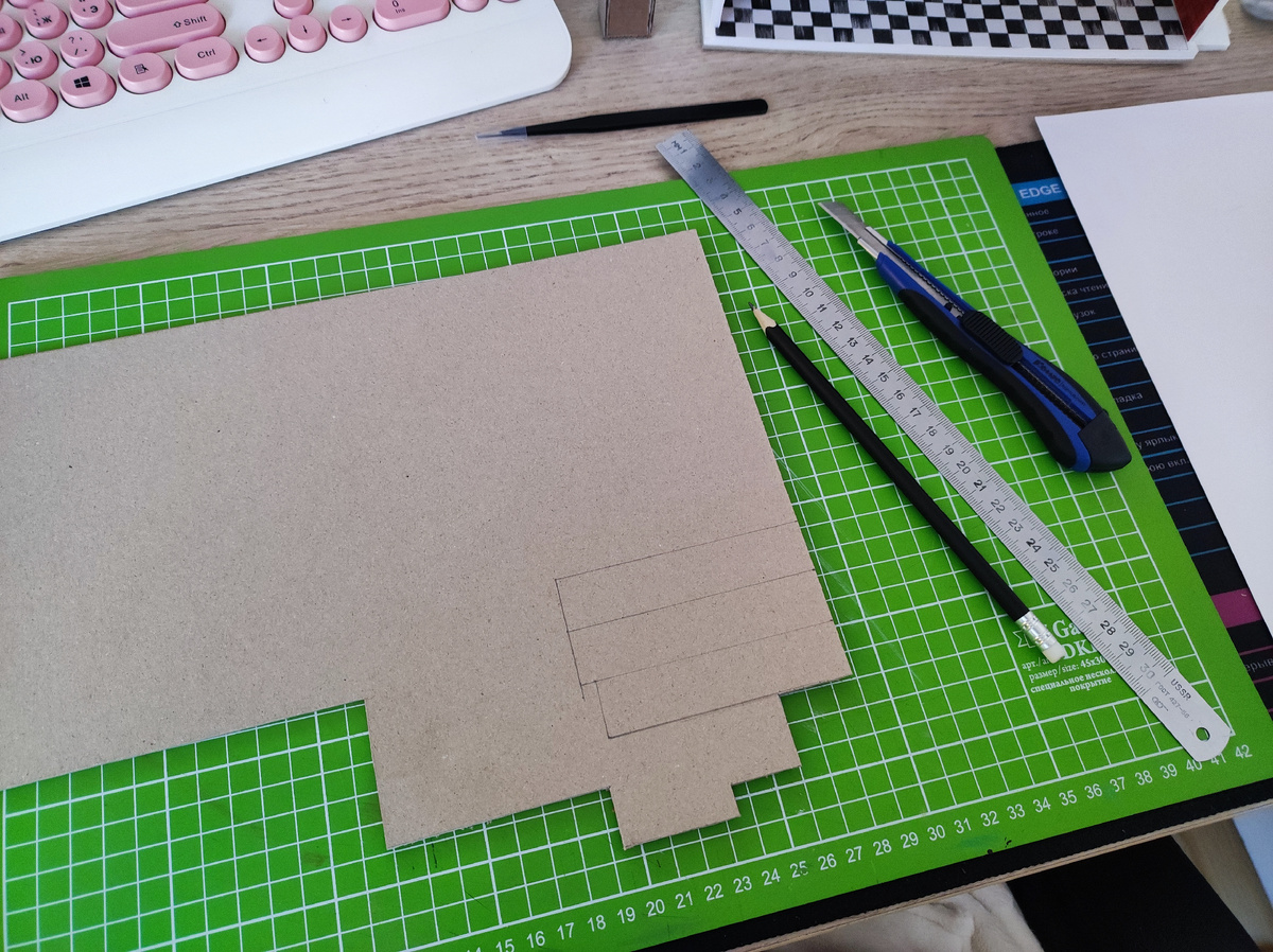 Сделать стеллаж было самым, наверное, простым. Я вооружилась картоном, линейкой, карандашом и резаком. Под