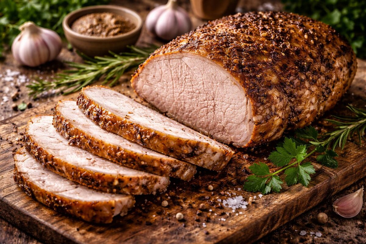 Колбасная нарезка в холодильнике вроде бы есть, но радости от неё всё меньше. Открываешь упаковку, а вкус какой-то не естественный, предсказуемый и через пару дней уже не хочется даже смотреть в её сторону, да и вообще уже есть нельзя😃. А вот когда в духовке запекается кусок мяса с чесноком и специями — это совсем другая история. Дом наполняется ароматом, который невозможно перепутать ни с чем. Мясо томится медленно, сок остаётся внутри, сверху образуется аппетитная корочка, а внутри плотная, сочная текстура. И такое хочется кушать всегда! А вы готовите дома буженину? Сегодня делюсь рецептом, который получается стабильно сочным и подходит и для горячей подачи и для холодной нарезки. Для буженины лучше всего подходит свиная шея или окорок. Кусок должен быть цельным, без костей, весом примерно 1,2–1,5 кг. Небольшие прожилки жира только приветствуются, именно они делают мясо сочным после запекания. Слишком постный кусок может получиться сухим, а слишком жирный будет тяжёлым. Оптимальный