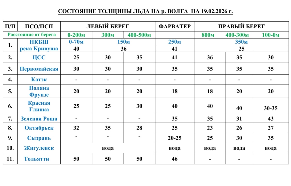 Поисково-спасательная служба Самарской области опубликовала актуальные данные мониторинга толщины льда на реке Волга по состоянию на 19 февраля 2026 года. Специалисты провели замеры на ключевых участках от Сызрани до Новокуйбышевска, и результаты оказались тревожными для любителей зимней рыбалки и пеших переходов. Самые опасные участки зафиксированы в районе Жигулевска. Согласно данным спасателей, на всем протяжении измерений — от левого берега до правого, включая фарватер, — открытая вода. Ледяной покров там полностью отсутствует. Тонкий лед также отмечен в районе Поляны Фрунзе. Там толщина покрытия варьируется от 18 до 20 сантиметров. На фарватере ближе к правому берегу (400-300 метров) зафиксировано всего 18 сантиметров. Неоднородная ситуация наблюдается в Сызрани. У правого берега лед окреп до 30-35 сантиметров, однако в центре русла (фарватер) его толщина составляет всего 20-25 сантиметров. Наиболее надежный ледяной покров традиционно сохраняется в верхней части Волги. В Тольятти