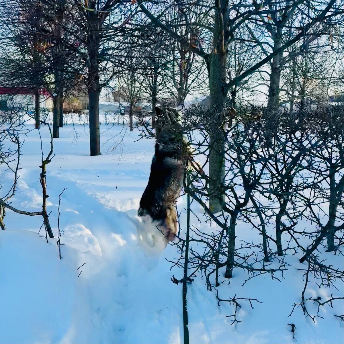 в сугробе валяется пакет с мусором. Яша делает коронный бросок за воображаемой мышью, старательно роет длинный подкоп и - о, чудо! - выныривает прямо рядом с пакетом.