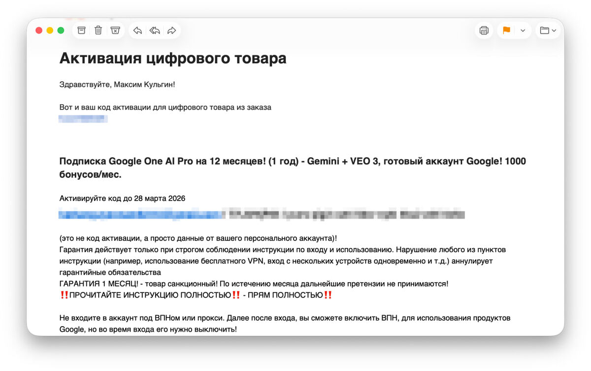 Короче, чтобы всем не отвечать в личке - вы когда покупаете подписку на 12 месяцев Gemini AI Pro, вам через 2-3 минуты приходит письмо с