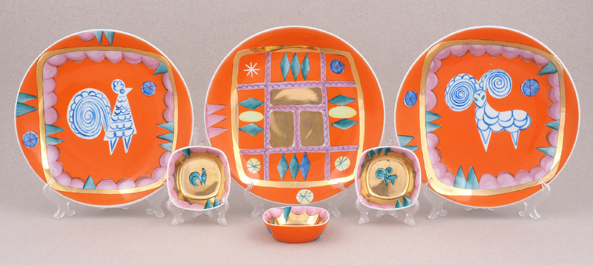 Блинный набор из 21 предмета называется «Солнышко» и декорирован яркой росписью. В ней используется сочетание селенового (ярко-оранжевого) крытья с участками золотого крытья. А разноцветные геометрические орнаменты и стилизованные изображения создают подчеркнутую декоративность художественного решения. Оно соответствует праздничному настроению масленичных гуляний — ожиданию солнечных дней и скорого весеннего тепла.