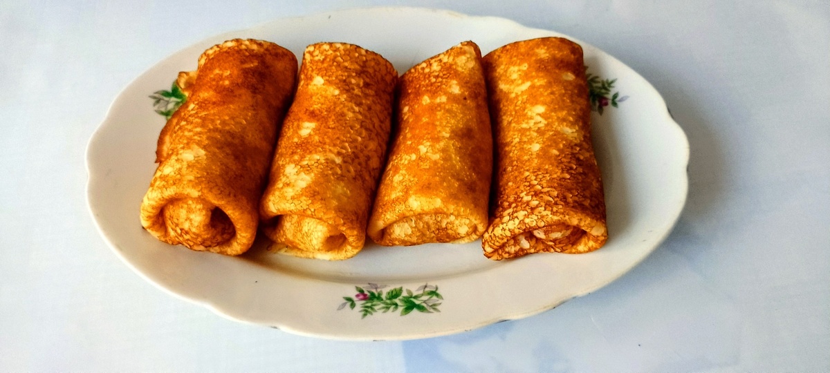 Символизирует прощание с зимой и встречу весны. Главным угощением Масленицы издавна считались блины — их круглая форма и золотистый цвет ассоциировались с солнцем и пробуждением природы. Хозяйки готовили десятки вариантов — тонкие и пышные, на дрожжах и без, с мёдом, сметаной, икрой, грибами, творогом и вареньем Блины со сливками. Ингредиенты: Молоко 900 мл Сливки 20% 150 мл Вода 500 мл (половина от количества молока со сливками) Мука 500 г Яйца 12 шт. Сахар 110 г, соль 17 г Масло растительное 200 г Технология приготовления: Смешать все погружным блендером, процедить через сито. Печь на слегка смазанной сковороде. Готовые блины смазывать мягким сливочным или топленым маслом. Начинка с яблоками и творогом . Ингредиенты: Яблоки (Симиренко) — 5 шт.; Изюм белый — 100 г; Сливочное масло — 120 г; Сахар, корица молотая — по вкусу; фундук — 30 г; творог 9% — 500 г; лимон (для воды под яблоки) — 1 шт. Технология 👇