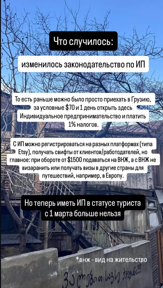 Со вчерашнего дня в грузинских экспатских кругах не очень весело, потому что с 1 марта начнется новое законодательство об ИП. Читайте на карточках из сториз 👆🏼