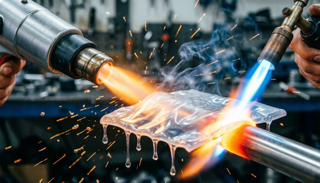 - Пластиковые трубы: Попытка отогреть замерзшую пластиковую трубу паяльной лампой приведет к тому, что труба просто лопнет от теплового удара или расплавится. Полипропилен не проводит тепло так быстро, как металл, и локальное пламя прожжет его насквозь. Феном греем медленно и аккуратно.