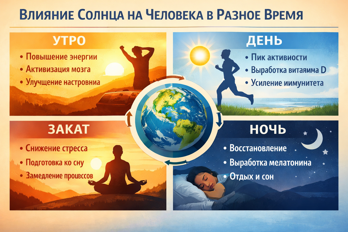 Введение Солнце — это источник жизни на Земле, но его влияние на человеческий организм намного глубже, чем мы часто осознаем. От древних времен люди замечали, что солнечный цикл влияет на их самочувствие, энергию и настроение. Сегодня наука подтверждает эти наблюдения, раскрывая механизмы взаимодействия солнечной активности и человеческого здоровья. Восходящее солнце — это природный будильник для нашего организма. Когда свет попадает на сетчатку глаза, происходит снижение уровня мелатонина (гормона сна) и увеличение кортизола (гормона, подготавливающего нас к деятельности). Что происходит: Совет: Выходите на солнце в первый час после пробуждения. Это поможет синхронизировать циркадные ритмы и улучшить качество сна ночью. В полдень солнце находится в зените, и наш организм находится в состоянии максимальной готовности к работе. Это оптимальное время для интеллектуальной деятельности и физических нагрузок. Особенности дневного периода: При закате солнца в организме начинаются обратные пр