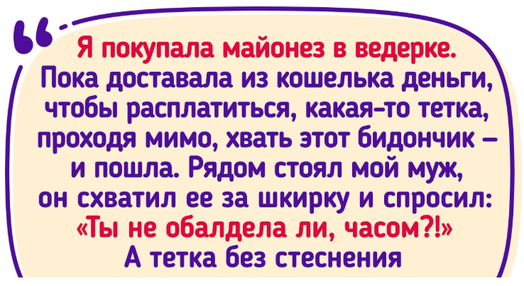 - Я покупала майонез в ведерке. Пока доставала из кошелька деньги, чтобы расплатиться, какая-то тетка, проходя мимо, хвать этот бидончик — и пошла. Рядом стоял мой муж, он схватил ее за шкирку и спросил: «Ты не обалдела ли, часом?!» А тетка без стеснения заявила: «Ой, я подумала, что это мое!» — сунула ему в руки майонез и свалила. © Helennae