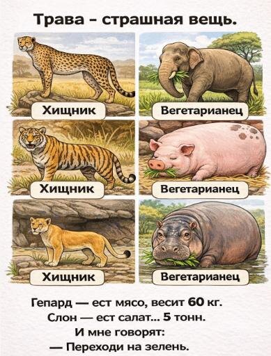… 😅 Зима — это, конечно, уют, плед, чай… но ещё и мало движения. И вот стою я у зеркала, смотрю на свои бока и думаю: «А как мне вернуть хотя бы то, что было прошлым летом?» Потому что лето уже не “когда-нибудь”, оно уже почти на пороге. И вроде бы пора задуматься… но внутри начинается спор. В правильном питании часто делают упор на зелень: салаты, листики, «давай побольше овощей». И я понимаю, что это правильно. Но потом смотрю на эту картинку: гепард ест мясо — 60 кг. Слон ест салат — 5 тонн… и у меня в голове: «Так… а где тут логика?» 🤣 Вот и получается мой внутренний конфликт: хочется худеть нормально, по-человечески — без голодовок, без самобичевания, без “после шести нельзя даже воду нюхать”. Но и продолжать жить “как зимой” тоже уже не хочется. Давайте честно: что реально помогло вам вернуться в форму к лету? 1) питание — что вы поменяли первым делом? 2) движение — что было самым простым и рабочим? 3) и самое главное: как не сорваться на “ну ладно, начну с понедельника”
