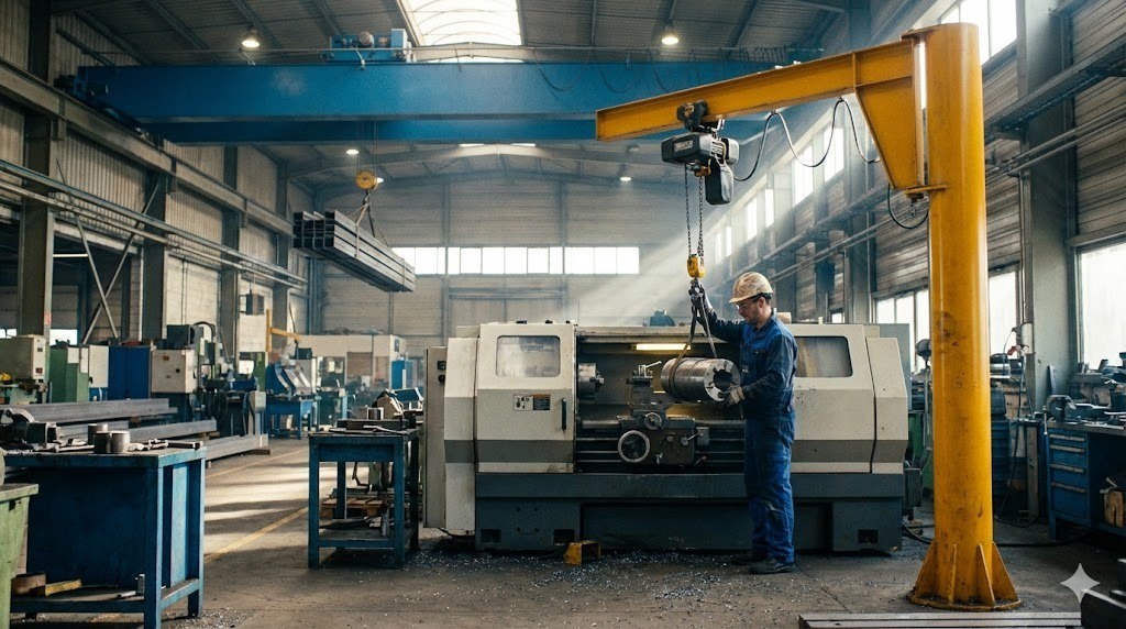 Это «индивидуальный инструмент» для рабочего места. Вот три варианта поста. От жесткого инженерного (про то, как не обрушить стену) до классического разбора «за и против». Вариант 1. Акцент на эффективность (Помощник большого брата) Заголовок: Зачем гонять фуру, чтобы перевезти коробку пиццы? В цехах часто вижу картину: Токарь стоит и курит 20 минут. Ждет, пока освободится большой мостовой кран, чтобы поставить заготовку весом 50 кг в станок. В это время мостовой кран занят на другом конце цеха разгрузкой металла. Это называется «скрытый простой». И он стоит денег. Решение — Консольный кран (Jib Crane). Это «личный кран» для локальной зоны: станка ЧПУ, сварочного поста или сборочного стола. ➕ Плюсы: Разгружает основной кран. Большой брат работает с тяжелыми грузами, консольник — с текучкой. Скорость. Оператор никого не ждет. Кран всегда под рукой. Цена. Стоит в разы дешевле мостового крана. Компактность. Если кран на колонне — занимает 0.5 м² пола. Если настенный — вообще 0.