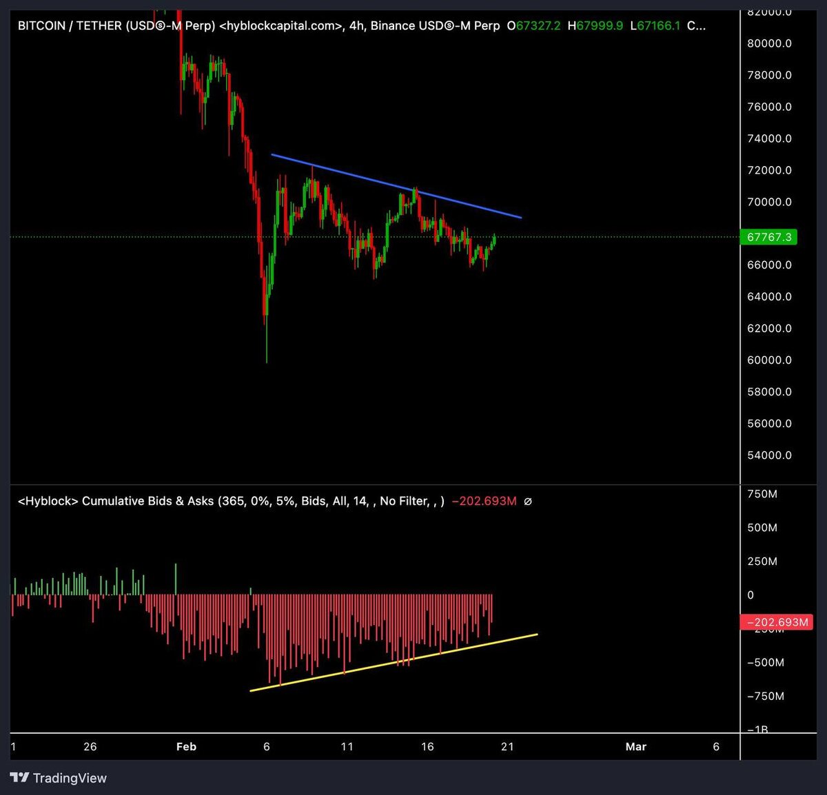 Но не могут его проглотить. Инвесторы, картина сейчас очень показательная. По стакану в пределах 5% от цены всё ещё висит перекос: примерно –$202 млн в сторону продавцов. Две недели назад было –$600 млн. То есть что происходит? Покупатели постепенно поглощают предложение. Каждый отскок — это выкусывание части sell-side ликвидности. Но есть проблема. Посмотрите на структуру цены — каждый хай ниже предыдущего. Lower highs. Системно. Что это значит на практике? Покупатели: – выходят – выедают часть оферов – теряют импульс – исчезают Продавцы: – дают отпор – цена скатывается – заново выставляют стенки И цикл повторяется. Это и есть фаза абсорбции без продолжения тренда. Абсорбция сама по себе не бычий сигнал. Она становится бычьей только тогда, когда: 1. продавца вычистили 2. цена закрепилась выше 3. импульс удерживается Сейчас этого нет. Да, дисбаланс сокращается. Да, sell side тоньше, чем был. Но пока рынок не может удержать рост, каждый отскок — это просто ликвидность для