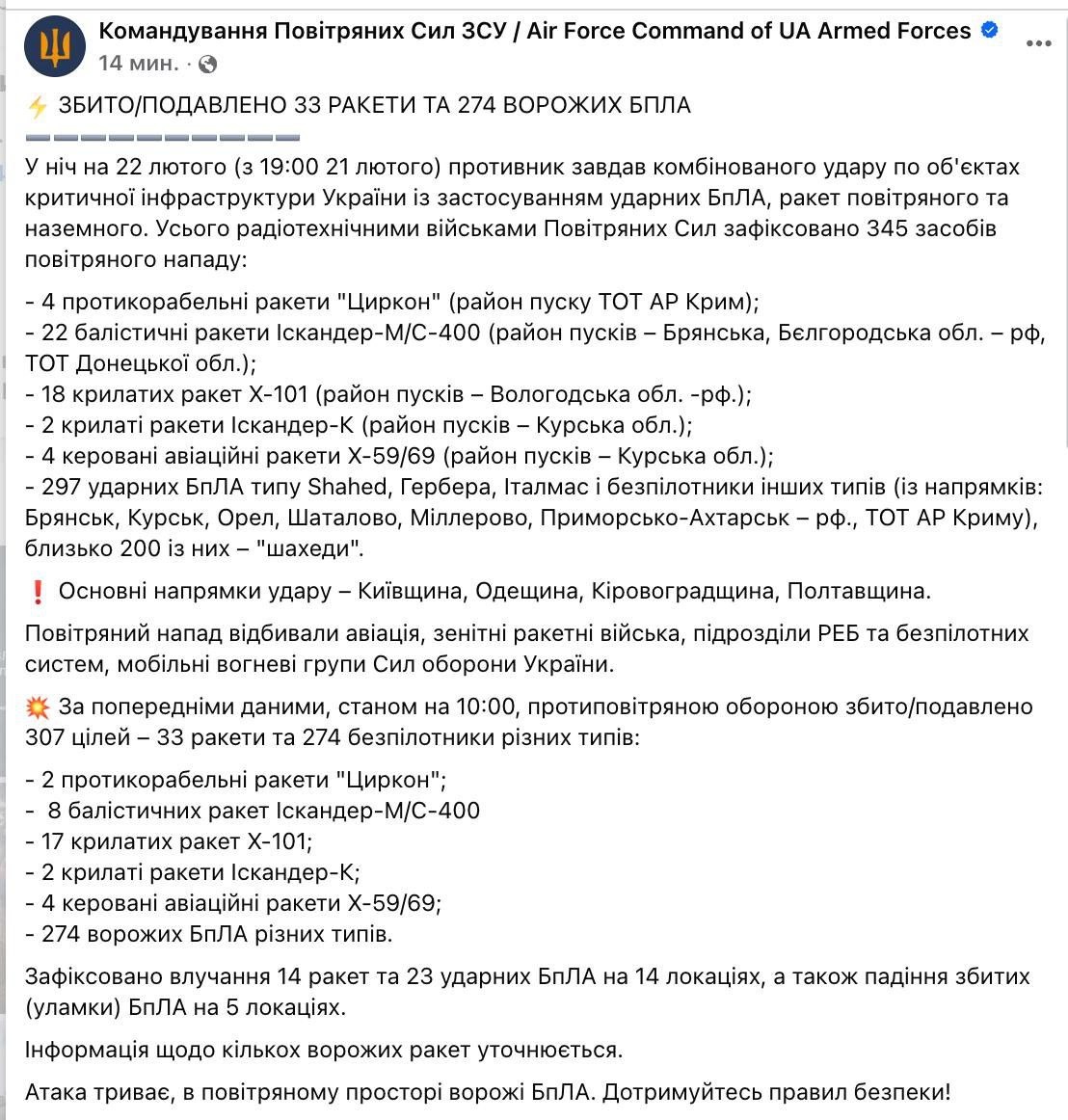 💥 География массированного удара по стране 404 этой ночью. По данным врага суммарно было выпущено 297 дальнобойных БПЛА-камикадзе различных типов, 18 крылатых ракет Х-101 и 4 крылатые ракеты Х-59М/Х-69 воздушного базирования, 22 баллистические и 2 крылатые ракеты ОТРК «Искандер», 4 гиперзвуковые ракеты «Циркон». Основной удар был нанесён по целям в Киеве и области. ✔️‼️🇺🇦🔥 Масштабный комбинированный удар по Украине: Киев и регионы под огнём ▪️С раннего утра, десятки мощных взрывов зафиксированы в Киеве и Киевской области — работали БПЛА и ракеты. ▪️Поражены энергетическая и военная инфраструктура: атакованы Трипольская ТЭС и ТЭЦ-6. ▪️По данным мониторинга, в ударах задействовано около 80 БПЛА «Герань», более 10 крылатых ракет Х-22, не менее 15 ракет «Циркон» и «Искандер», а также Х-101. ▪️Удары нанесены по объектам энергетики в Кировограде, Николаеве, Днепропетровске, Сумской области, Одесской области. ▪️Сообщается также о прилётах в Кропивницком и Кривом Роге. ✔️‼️🇺🇦🏴☠Масс