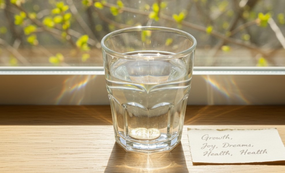 «Как солнце весеннее силу набирает, так и желание мое прорастает. Вода-водица, солнца сестрица, силой зарядись, в дело обратись! Монетка на дне — удача ко мне. Солнце в небе сияет — мои мечты исполняет. Да будет так!» - Оставьте стакан стоять на подоконнике как можно дольше, чтобы он впитал солнечные лучи (хотя бы 1-2 часа).