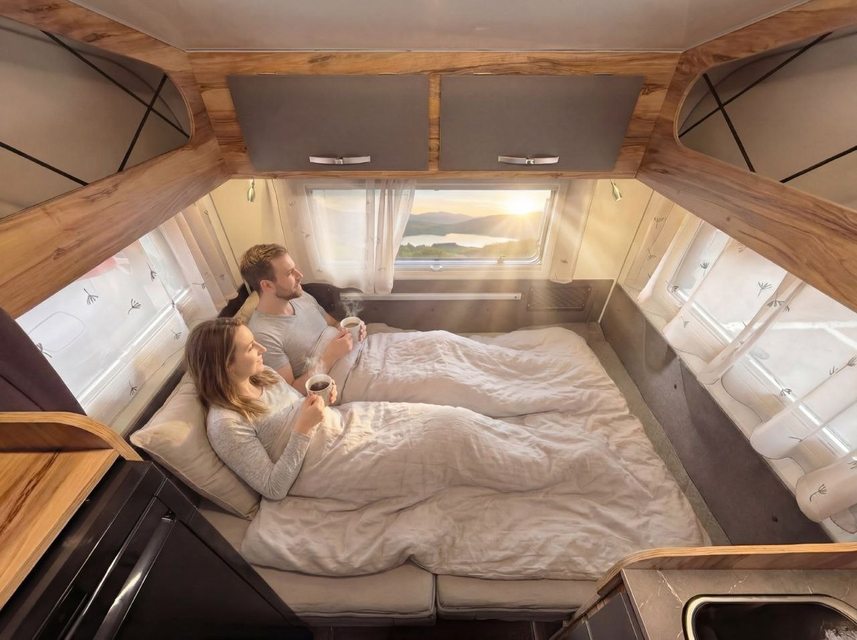 , бодрым и полным сил. Но чтобы эта романтика была идеальной на все 100%, к ночевке нужно самую малость подготовиться. Вот 5 секретов для самого сладкого сна в кемпере: 1. «Фундамент» комфорта — ровный пол. Спальное место должно быть ровным (допускается лишь легкий наклон, при котором изголовье будет чуть приподнято). Обязательно выставьте прицеп по уровню, используя подкатные клинья. 2. Впустите свежий воздух Главный секрет бодрости — кислород. Обязательно оставляйте люк или окно на микропроветривании, даже если на улице прохладно. 3. Настройте уровень тишины Засыпать под шум дождя или пение сверчков — это кайф. Но иногда природа бывает слишком громкой (например, лягушки у озера). Если у вас чуткий сон, возьмите с собой пару берушей. 4. Уютное гнездышко по сезону На природе перепады температуры ощущаются острее. В летний сезон лучше всего спать на постельном белье из дышащего льна или хлопка. А вот в холодное время года отлично выручает флис — он теплый и не впитывает влагу. 5.