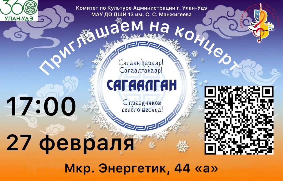 ! 27 февраля в 17:00 в зале ДШИ №13 по адресу: Энергетик 44 «а» состоится праздничное мероприятие, посвящённое традиционному бурятскому Новому году — Сагаалгану. Вас ждёт яркая музыкальная программа, исполнение народных мелодий и атмосфера настоящего праздника! Не упустите возможность окунуться в культуру и традиции вместе с нами. 🎟 Билеты доступны по ссылке: https://iframeab-pre7119.intickets.ru/seance/70598394 Ждём вас на концерте! #дши13_уу