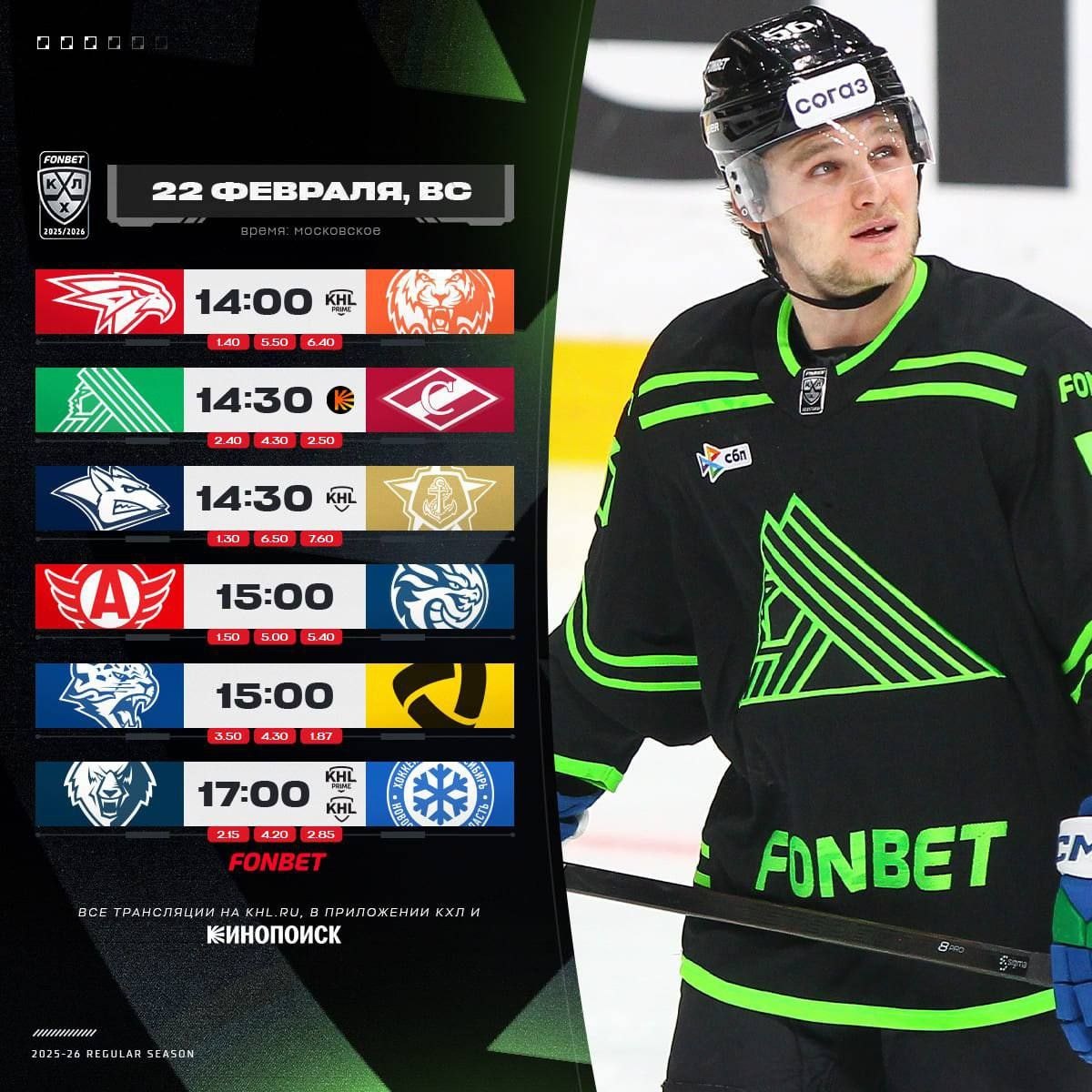 В шести матчах игрового дня КХЛ «Авангард» примет «Амур», «Салават Юлаев» сразится со «Спартаком», «Металлург» проэкзаменует «Адмирал