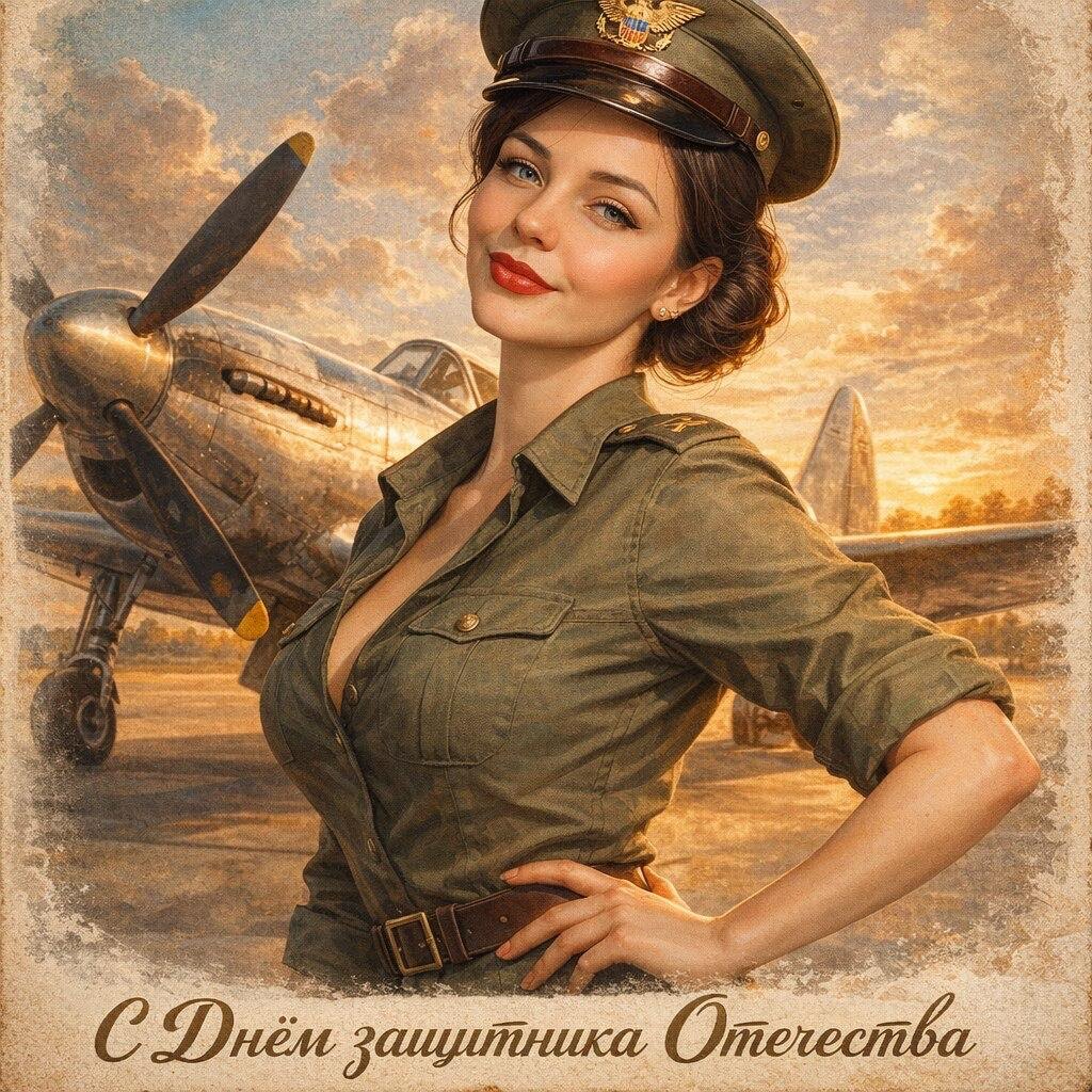 Модель: Nano Banana Сгенерировать🪄 Промпт: Художественная иллюстрация в стиле пин-ап и ретро-реализма: красивая молодая женщина-пилот в военной форме середины XX века. На ней серо-зеленый китель с закатанными рукавами, кожаный ремень и фуражка с золотой эмблемой орла. У нее классический макияж с ярко-красными губами и аккуратная прическа пучок. Девушка стоит на фоне винтажного одномоторного истребителя с блестящим стальным корпусом и пропеллером. Стиль сочетает четкую прорисовку персонажа и мягкие акварельные мазки по краям кадра, имитируя старую открытку или плакат. Теплое закатное освещение, мягкие тени, высокая эстетика ретро-авиации. Не меняя черты лица. Внизу надпись: *С Днём защитника Отечества*