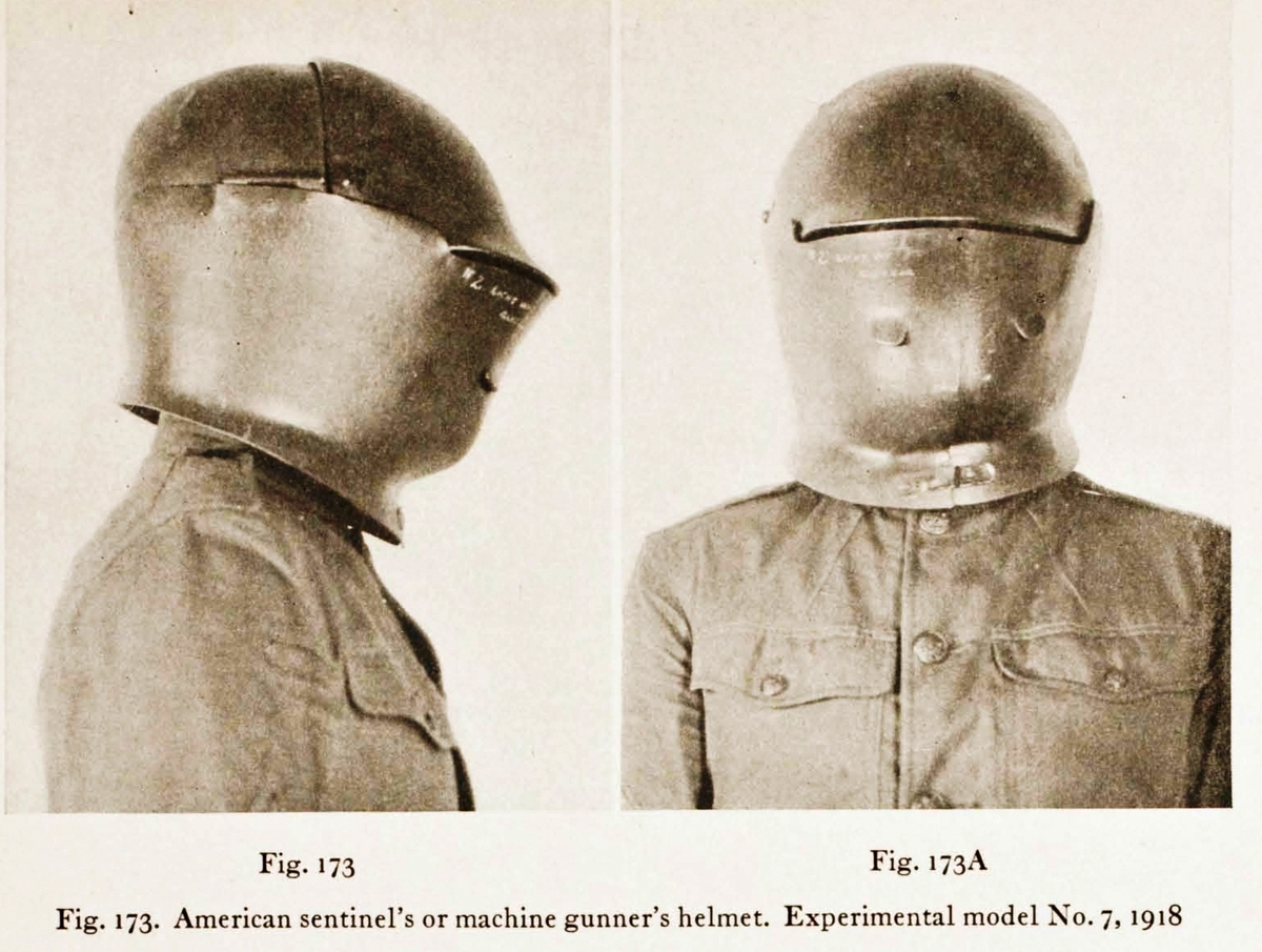 Американский пехотный шлем "Helmet Model No.7 "Sentinel" был разработан доктором Бэшфордом Дином между 1917 и 1918 годом в рамках серии экспериментальных прототипов. Дизайн Шлема №7 основывался на ранних европейских шлемах, сочетая конструктивные особенности итальянского Армэ конца пятнадцатого века и осадных шлемов начала семнадцатого. Шлемы изготавливались из никель-марганцевой стали Бейкера компанией "W.H.Mullins Co." в городе Салем, штат Огайо и подвергались термической обработке на заводе Питтсбургской лесопильной компании. Шлем изготавливался из четырех стальных пластин и окрашивался в зеленый цвет. Передняя пластина защищала лоб и верхнюю часть головы, другая заднюю половину головы и шею. Их верхние части соединялись заклепками. Две боковые пластины прикреплялись на шарнирах к задней части верхней пластины и закрывали нижнюю часть головы, перекрывая друг друга спереди и сзади. На боковых частях под прорезью для глаз прорезались два вентиляционных отверстия, а под подбородком при