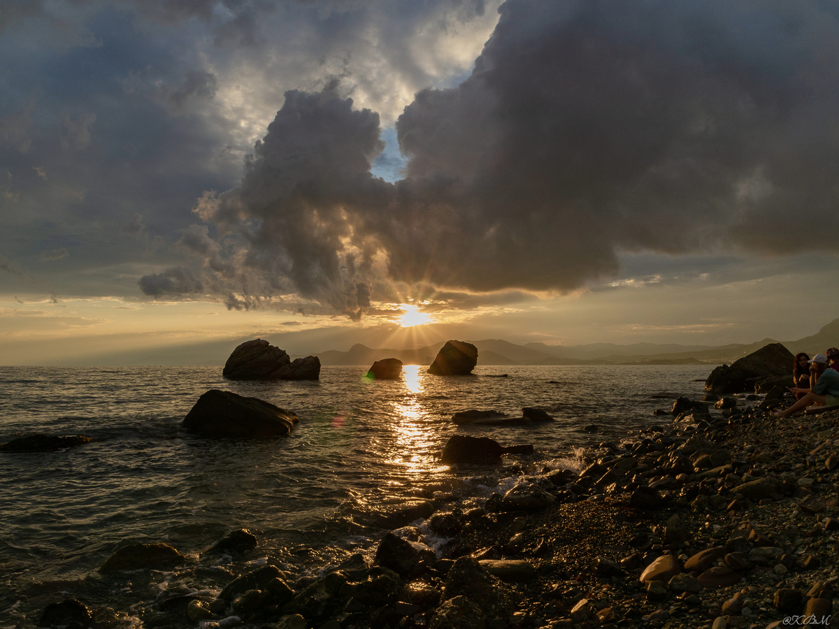 солнечное место в Крыму, над Судаком сгущаются чёрные тучи, гремит гром,